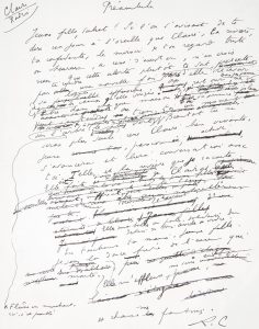 Manuscrit autographe de premier jet monogrammé par René Char, comportant de très nombreuses corrections, quelques variantes avec le texte imprimé. (Pléiade p.654). ^ « Jeune fille salut ! Si l'on s'avisait de te dire un jour à l'oreille que Claire, la rivière ta confidente, le miroir de ton regard triste ou heureux a cessé d'exister, n'en crois rien ».