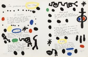 Poème manuscrit de René Char enluminé par Joan Mir^, l'ensemble reproduit par Daniel Jacomet. Le procédé Jacomet, tenu jalousement secret, s'apparente à la lithographie. Tirage à 120 exemplaires numérotés et signés au verso par René Char. Superbe réalisation.