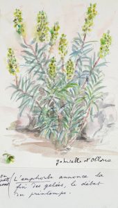 Aquarelle originale de Gabrielle d'Ollone signée adressée à Louis Barnier Directeur de l'imprimerie Union pour la publication de la plaquette de Char Verrine, illustrée par Gabrielle d'Ollone. Note autographe de Char contrecollée à l'aquarelle : « en petits caractères l'euphorbe annonce la fin des gelées et le début du printemps ». Enveloppe conservée adressée par René Char à Louis Barnier.