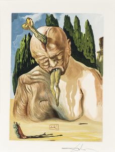 Un Diable logicien (Enfer, Chant XXVIII de la Divine Comédie illustrée par Dali). Rare épreuve signée au recto par Salvador Dali et contresignée au verso par Jean Estrade, éditeur de La Divine Comédie.