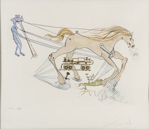 DALI Salvador. LE FREIN HYDROLIQUE. POINTE-SÈCHE ET POCHOIR SIGNÉ. Editions d'Art de Francony, 1980. Dimensions de la cuvette : 36,5 x 50,7 cm ; dimensions de la feuille : 56,5 x 76,5 cm, sous encadrement.