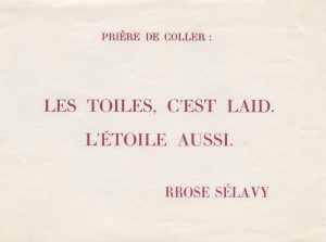 Affichette autocollante de cet amusant jeu de mots de Marcel Duchamp destinée à être collée sur les murs, conçue pour l'ouverture de la galerie l'Etoile Scellée le 5 décembre 1952 à Paris. Elle porte la signature imprimée Rrose Sélavy. Rare.