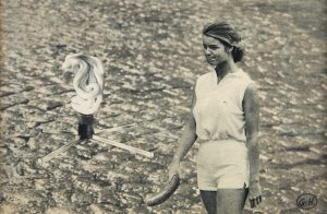 Collage original sur papier portant le cachet de Georges Hugnet, représentant une jeune fille en tenue de sport tenant à la main un objet phallique.