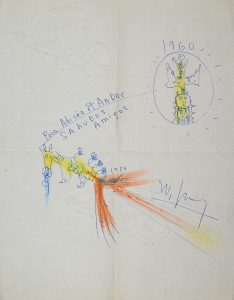 Dessin original au stylo à bille, rehaussé de couleurs, dédicacé à Elisa et André Breton, daté et signé au recto par Wifredo Lam, figurant en 1959 le passage de la nouvelle année. (Pliures centrales). Enveloppe adressée par Wifredo Lam à André Breton conservée, au dos de l'encadrement.
