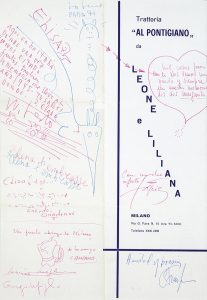 Dessin original de Wifredo Lam sur papier du restaurant Al Pontigiano, à Milan, au stylo à bille bleu et rouge, signé et portant une dédicace à Elisa Breton. Petit dessin au stylo à bille rouge signé par Camacho. Dédicace et signatures de Tapiès, d'Elena et de Cardenas.