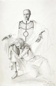 Dessin original à l'encre sur papier légèrement rehaussé de lavis, dédicacé, daté et signé au recto par Stanislao Lepri, représentant une femme effondré auprès d'un homme sans enveloppe charnelle. Stanislao Lepri fut le compagnon de Leonor Fini.