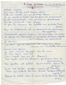 Manuscrit autographe au stylo à bille (2 pages in-4) titré Croissant de Brume. ^ « Malade, sur mon lit de mort toujours frais, telle une mouche sur un fromage blanc, je me console à l'idée que tes yeux me survivront, qu'ils recaresseront nos animaux faméliques, qu'ils reverront nos plages, et que les cheveux des fillettes au fond de l'eau grise qui se balancent et se pavannent au passage des poissons charmeront comme toujours vos prunelles vivipères » ^ Deux lettres autographes signées à André Breton, 3 pages et demie in-12, enveloppe conservée. ^ « merveilleux livre « La Pornographie », l'auteur transforme son lecteur en voyeur haletant et narcisse et la scène de la mort avec le crucifix inutile et spectateur lui aussi. Encore une pierre dans le jardin Klossowski. Je pars pour la Corse. Je pense à vous. Toujours votre Joyce. »^