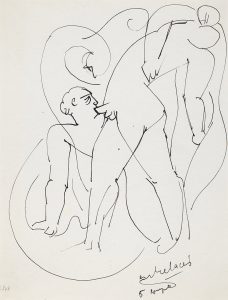 Dessin original à l'encre sur papier titré « Entrelacés 5 couples » par André Masson représentant au premier plan une scène de fellation. Timbre sec d'André Masson. Un certificat du comité Masson sera remis.