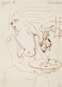 Dessin original à l'encre sépia titré « Hérodiade musée II » par André Masson représentant une femme seins nus tenant dans sa main une paire de testicules. Timbre sec d'André Masson. Un certificat du comité Masson sera remis.