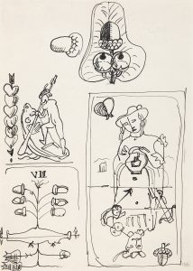 Dessin original à l'encre d'André Masson, étude pour le jeu de cartes de Marseille des surréalistes. Timbre sec d'André Masson. Un certificat du comité Masson sera remis.