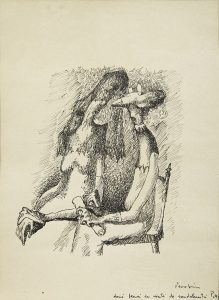 Dessin original à l'encre sur papier titré, daté et signé au recto par Jules Perahim représentant une jeune femme près d'une femme plus âgée au curieux visage.