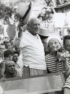 Tirage argentique de l'époque légendé au verso par André Villers : « Fête en l'honneur de Picasso à Vallauris à gauche en bas Michel Leiris ». Tampon d'André Villers au verso. Reproduit dans l'ouvrage de Jacques Prévert : Portraits de Picasso, Ramsay, 1981.