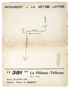 Le Pilhaou-Thibaou constitue le numéro 15 de la revue 391. Textes de Francis Picabia, Pierre de Massot, Georges Auric, Clément Pansaers, Funny-Guy (pseudonyme de Picabia) qui en anglais familier signifie rigolo. Illustration de Picabia : Monument à la Bêtise latine. (pliure centrale et restauration). Cet important numéro de 391 est rare.