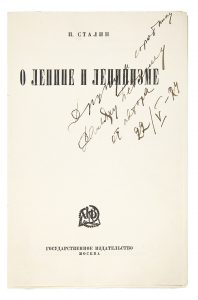 Edition originale. Envoi autographe de Joseph Staline au poète Dimian Bedniy daté du 22-V-24. Bel exemplaire. Les dédicaces de Staline sont de la plus grande rareté