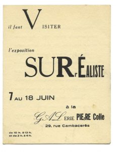 [SURRÉALISME]. IL FAUT VISITER L'EXPOSITION SURRÉALISTE. CARTON D'INVITATION. Paris, Galerie Pierre Colle, [1933]. Plaquette de 13,8 x 10,7 cm, deux feuillets imprimés recto-verso.