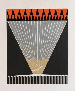 dorée sur les coupes, tête dorée, couverture et dos conservés, intérieur doublé de feutrine rouge, filets dorés d’encadrement des contre plats. Compositions gravées sur bois par Philippe Burnot d’après les compositions en noir, rouge et argent de Claudius Linossier. Tirage numéroté limité à 133 exemplaires. Celui-ci, nominatif, au nom d’un bibliophile, membre du Cercle Gryphe. Extraordinaire ouvrage Art Déco dû au dinandier Claudius Linossier (1893-1953). Orné à toutes les pages de compositions décoratives gravées sur bois par Ph. Burnot, tirées en rouge, gris, noir et rehaussées au palladium. Le Lyonnais Claudius Linossier est à la dinanderie ce que Jean Dunand est à l’art des laques. Sa science du métal, il la transpose, de façon tout à fait originale dans l’univers du livre. Ces décors géométriques, dont les reflets argentés captent et diffractent la lumière, évoquent de manière purement abstraite les éléments qui sont à la base de ce grandiose poème en prose : l’eau, le feu, la montagne. Imprimé à Lyon en gros caractères, par Audin, avec une subtile mise en page jouant sur les symétries, les inversions, les volumes et la fantaisie. La reliure, non signée, est en symbiose parfaite avec l’ouvrage. L’ensemble nous donne un grand livre de la période Art Déco.