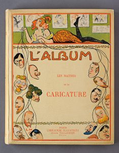 L’ALBUM - LES MAÎTRES DE LA CARICATURE. AQUARELLES ET DESSINS INÉDITS. Préfacede Roger-Milès. PARIS, TALLANDIER, 1902. Un fort volume, in-4, cartonnage éditeur illustré en couleurs sur fond de percaline crème, tête dorée. Bel exemplaire...
