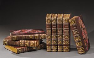 MOLIÈRE (Jean-Baptiste Poquelin, dit) - AQUISTAPACE. THÉÂTRE. NICE, Joseph PARDO, 1949. Huit volumes, in-4, demi-reliures à coins en chagrin prune. Dos à nerfs très ornés et dorés portant les titres dorés, têtes dorées, non rognés,...