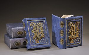 présentant un important décor en creux, guirlande et semis de palettes dorées, au centre pièce métallique imitant un P gothique décoré d’un dragon et de flammes en noir,vert et rouge, boîtier de luxe. Reliure d’art Sefer. 21 compositions couleurs par Dominique Pardigon. Tirage limité à 1300 exemplaires sur vélin d’Arches. L’un des 32 exemplaires de tête comprenant un in-texte original en couleurs - une illustration originale en couleurs -une double planche en couleurs encadrée (manquante) - une suite en couleurs et une suite du trait des illustrations hors-texte en violet de Parme.
