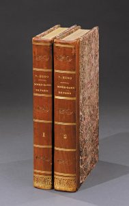 sur la page de titre du premier volume, trace de vignette ex-libris sur les contre-plats. Édition originale. Deux vignettes de titre gravées sur bois par Porret d’après Tony Johannot. Avec les fautes de pagination au tome II (pp. 491 et 495). Un des exemplaires imprimés avec une mention fictive d’édition (deuxième édition) ; une annonce de l’éditeur dans le Journal des Débats du 10 mai 1831 explique la division du premier tirage en quatre soi-disantes éditions, destinées à faire croire au succès du livre. Michaux in Bulletin du Bibliophile, 1931 conclut que les exemplaires ainsi faussement désignés comme de seconde, voire de troisième édition, appartiennent authentiquement à l’édition originale. L’édition originale a été tirée à 1 100 exemplaires et divisée en 4 tranches d’environ 300 exemplaires. Chaque tranche à l’exception de la première, porte une mention d’édition. Notre exemplaire est donc situé entre le 301e et le 600e exemplaire de l’édition originale. Bel exemplaire, très frais, dans une reliure strictement de l’époque.