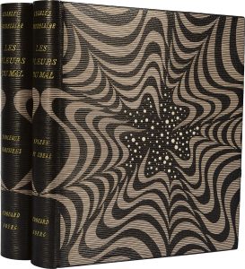 BAUDELAIRE (Charles). Les Fleurs du mal. Spleen et idéal. Paris, Marcel Sautier, 1948-1952. 2 volumes in-4, maroquin noir, décor mosaïqué de jeux d'arbesques de veau glacé gris irradiant depuis le centre d'où jaillissent des pastilles blanches,...