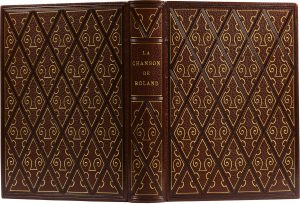 BÉDIER (Joseph). La Chanson de Roland. [Paris], Société Hippocrate et ses amis, (1932). In-4, maroquin bordeaux, listels de maroquin prune formant un treillis de losanges sertissant des motifs dorés, dos lisse orné de même, tranches dorées sur...