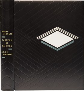 BERNARD (Tristan). Tableau de la Boxe. Paris, Éditions de la Nouvelle Revue Française, 1922. In-8, box noir, plats ornés d'un jeu de filets à froid, au centre du premier, losange mosaïqué de box blanc encadré de listels de box blancs et verts,...