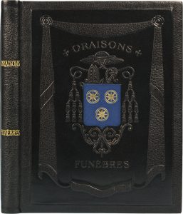 BOSSUET (Jacques-Bénigne). Oraisons funèbres. Paris, Les Livres de Louis Jou, 1939. In-4, maroquin noir, premier plat orné d'un blason poussé à froid, au centre pièce de maroquin bleu portant les armes dorées, dos lisse, tranches dorées,...
