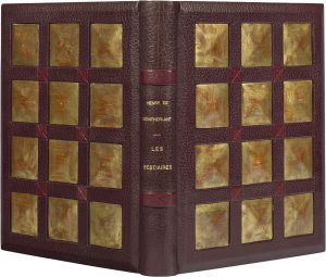MONTHERLANT (Henry de). Les Bestiaires. S.l. [Paris], Les Bibliophiles franco-suisses, 1932. In-4, maroquin grenat à décors de caissons dorés et ocre, dos lisse orné de faux nerfs de maroquin mosaïqué, tranches dorées sur témoins, doublure et...