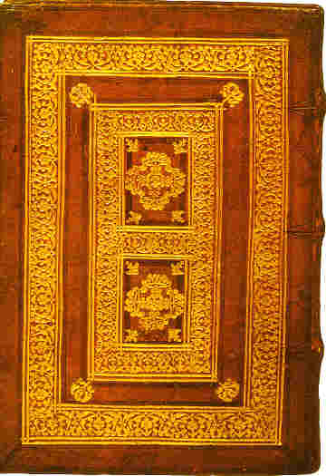 Plat ( veau ) d'une reliure dèbut 16ème ( vers 1520 ). Plat très richement orné de deux encadrements de filets à froid alternés avec deux larges cadres d'arabesques et de fleurs dorées.