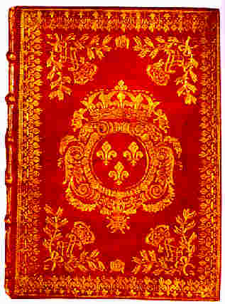 Reliure ( maroquin rouge) aux armes de Louis XIV, avec monogramme Royal aux angles.