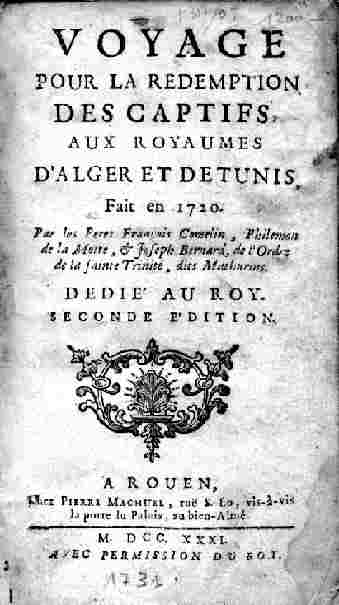 "Voyages pour la rédemption des captifs aux Royaumes d'Alger et de Tunis, fait en 1720...par les frères Comelin, La Motte et Bernard..." Cet ouvrage est le récit des démarches effectuées par des frères religieux en vue de faire recouvrer la liberté à des chrétiens captifs et esclaves chez les Maures en Algérie et en Tunisie. Il comporte ausssi une description de la ville et de la société d'Alger. En outre, on y trouve une liste nominative des personnes qui ont été libérées. L'ensemble de l'opération de sauvetage est ensuite mis en perspective par une réflexion sur le sens de ce geste dans la vie d'un croyant. l'édition originale est imprimée à Paris, chez Louis-Anne Sevestre, Pierre-François Giffart, 1721, in.16°, (12)-169-LX-306 pp., ill : un portrait de Louis XV par Giffart, + planches et cartes. 2e édition : A Rouen, chez Pierre Machuel, M.DCC.XXXI (1731), in.8°, 270.pp. |