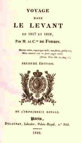 C'est François-René de Chateaubriand, qui a probablement déterminé la vocation de Louis de Forbin à prendre la mer en 1817, pour se rendre en Asie Mineure ( Constantinople, Ephèse ), la Palestine et l'Egypte ou il remonte le Nil, vers la Haute. Comme Chateaubriand (Voyage en Terre Sainte,1806), son voyage est due à son initiative personnelle, mais il a obtenu la mission de peindre et de rapporter des antiquités, ce qui lui vaut la faveur de voyager sur une frégate de l'escadre du Levant, la Cléopâtre. Il est accompagné par "M. Prévost dessinateur, connu par ses beaux panoramas", et par un jeune élève de la marine qui avait quitté la frégate pour s'attacher à M. Prévost, Linant de Bellefonds. Dans son voyage, Forbin se montre un mûr observateur. Il possède une forte culture humaniste, mais en use avec discrétion. Son style est souvent un pastiche maladroit de celui de Chateaubriand (Voyage en Terre Sainte, 1806). Ce n'est pas un écrivain de métier mais en revanche il est peintre, donc plus précis dans ses descriptions. (F. Bassan) |